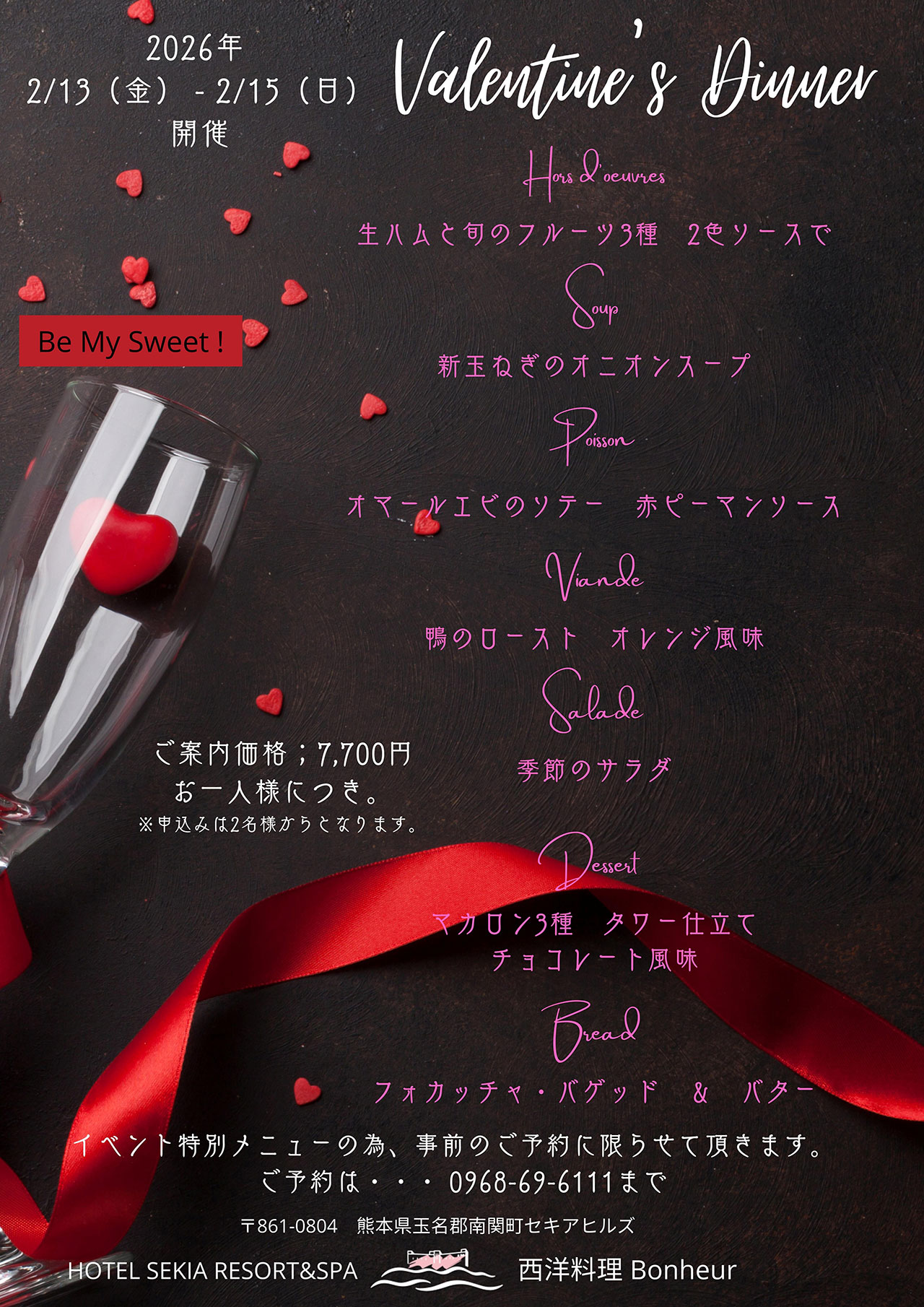 ホテルセキア内の西洋料理レストラン「ボヌール」では、2026年のバレンタインシーズン限定で、心温まるフルコースディナーをご用意いたしました。旬の熊本食材や彩り豊かな野菜をふんだんに使用したお料理は、記憶に残るひとときを演出します。